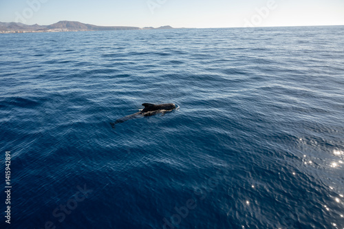 © barmalini, Naklejka premium Watching flock of dolfins and whales from touristic boat, south of Tenerife island, Canary, Spain, wildlife seascape