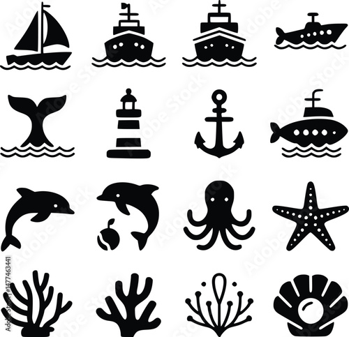 © Saidurra12, Fototapeta premium Water Activities & Marine Life Icons Ocean Adventure Shark, Octopus, Lighthouse Graphics