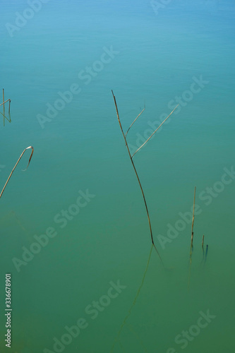 Fototapeta premium Water Aqua Menthe surface of the lake in Ukraine. Reed stem on turquoise...