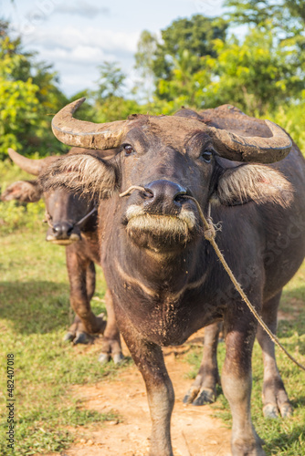 Obraz premium Water Buffalo in a Rice Field Thailand Southeast Asia