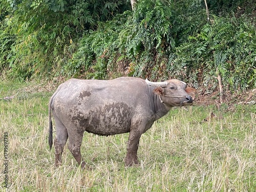 © Rezki, Naklejka premium Water buffalo standing in a field. The animal is covered in mud and has a rope around its nose