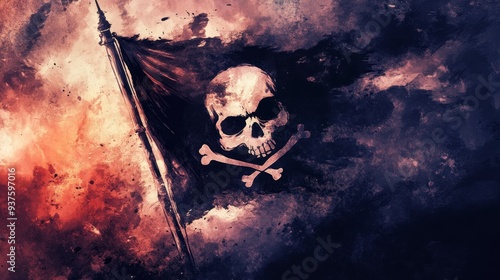 © Naphol, Naklejka premium Water color of A striking pirate flag featuring a skull and crossbones, set against a dramatic, colorful background, representing adventure and danger.