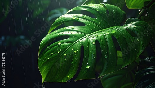 Obraz premium Water dripping from a wet tropical Monstera leaf during a downpour in the...