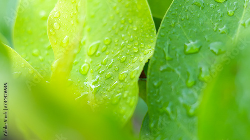 © Bangun, Fototapeta premium Water drop on green leaf after rain. Nature background and wallpaper.