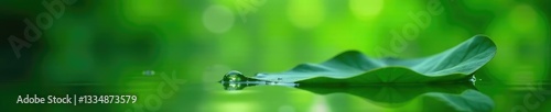 © Chanchai, Obraz premium Water droplet suspended on the surface of a green leaf amidst calm water, water, green, reflection