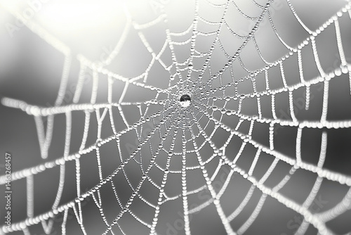 © Nigina, Naklejka premium Water droplets clinging to a spider web, glistening in the sunlight.