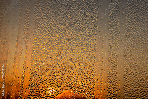 Obraz premium water droplets from condensation on the window glass at sunset, wet glass...
