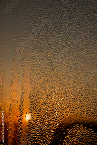 Obraz premium water droplets from condensation on the window glass at sunset, wet glass...