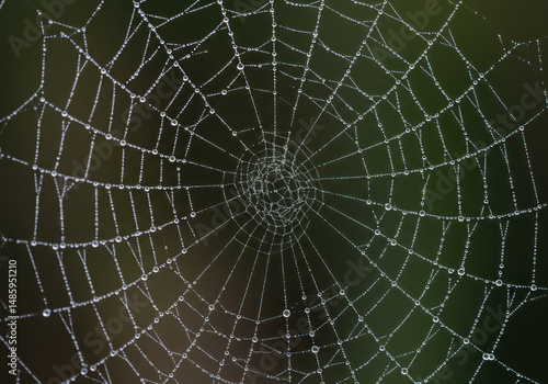 Obraz premium Water droplets glisten on spider web.