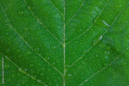 © peterkai, Fototapeta premium Water droplets on a green leaf.