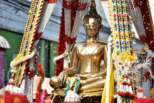 Fototapeta premium Water drops are splashing on a gold Buddha image