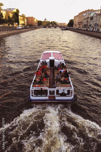 Naklejka premium Water excursions along on the boat the rivers and canals by historical places of St. Petersburg, Russia