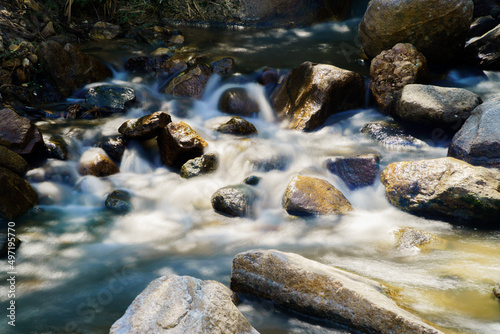 © Eakkarach, Fototapeta premium Water flowing along rocks in nature, waterfall