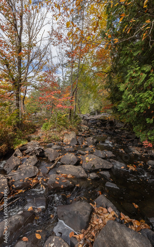 Naklejka premium Water flowing down a rocky river with autumn colours in surrounding forest in Ontario Canada