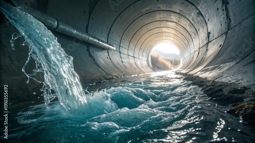 Fototapeta premium Water flowing from a pipe into a concrete tunnel with light at the end...