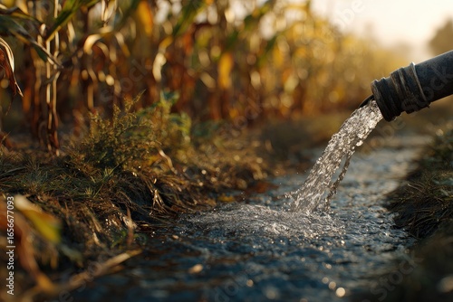Obraz premium Water flowing from pipe into a field