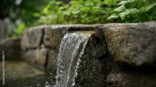© Selvi, Obraz premium Water flowing over a weathered stone wall in a natural outdoor setting