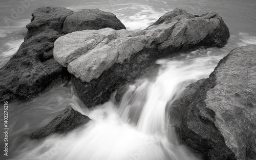 Fototapeta premium Water Flowing Over Dark Rocks, Black and White