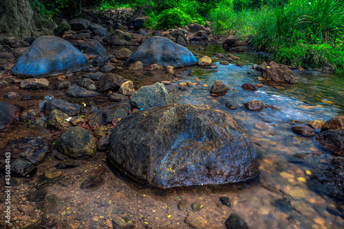© AFZALKHAN, Fototapeta premium Water flowing through stones and down small rock steps natural scene.