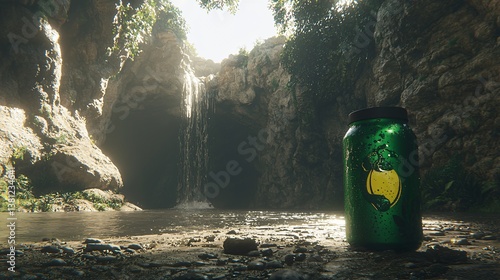 © Lensora, Fototapeta premium Water flows into a grotto. Wet can stands nearby in sunlight