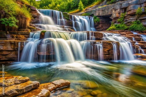 © Autun, Obraz premium Water flows smoothly, then abruptly plunges over rugged rock facings, creating a foamy, churning pool at the base of the thunderous waterfall.