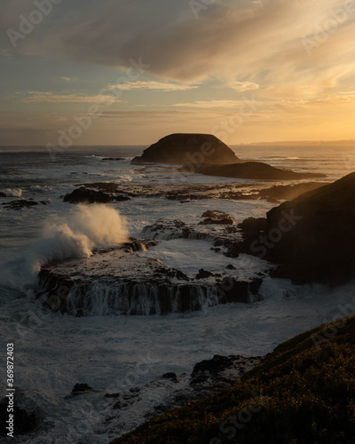 © Nolan, Obraz premium Water from the rough sea being smashed against the cliffs in Australia at sunset