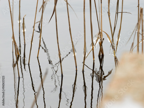 © Felix Geringswald, Fototapeta premium Water frozen on dry grass next to a shore of a lake. Ice drops in the nature. Beautiful environment during winter season. Natural phenomenon of cold weather.