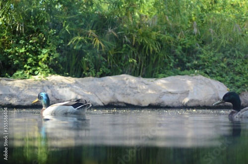 © Naoufal, Fototapeta premium Water level view of Mallard ducks (Anas platyrhynchos) floating on the river