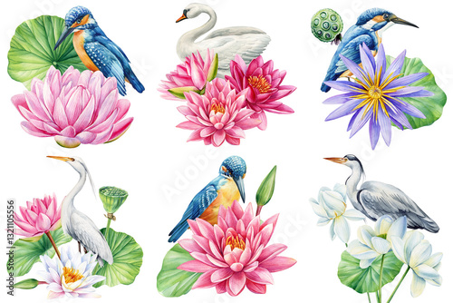 Fototapeta premium Water lilies and birds. Watercolor illustration with lotus flowers heron, kingfisher, swan. Elegant nature art design