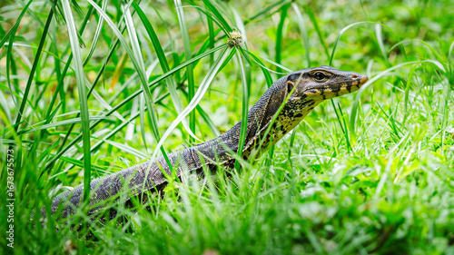 © Pawich Sattalerd, Naklejka premium Water monitor lizard hiding in green grass