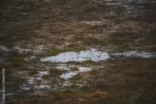 Obraz premium water on the ground. sewage and draining problems. heavy rain in rural areas with water puddles on the soil