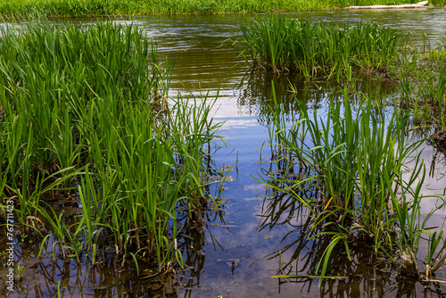 © Oleh Marchak, Fototapeta premium Water plants corn dog grass beside the river. Typha latifolia is also known as reed flower bulrush