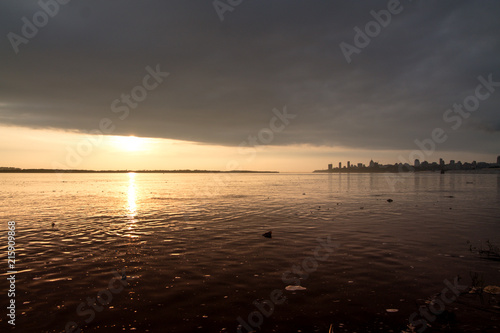 © kapichka, Naklejka premium water pollution in a river with a city view on the horizon during the sunset