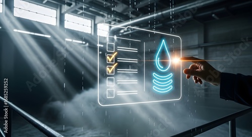 © Batoor, Naklejka premium Water quality assessment interface with checklist and droplet icons, sustainable resource management concept.