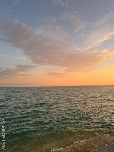 © Veronika, Fototapeta premium Water surface at sunset with warm light and reflections