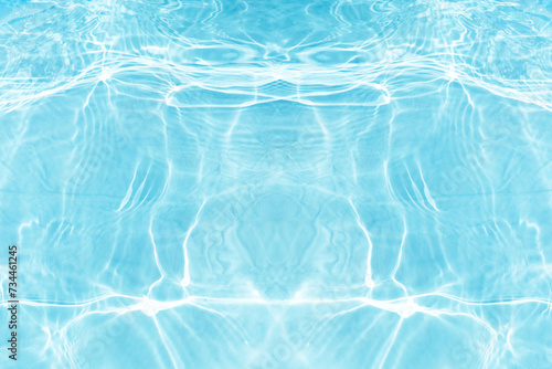 Obraz premium Water surface. Bluewater waves on the surface ripples blurred. Defocus blurred transparent blue colored clear calm water surface texture with splash and bubbles. Water waves with shining pattern.