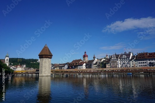 © Janin, Naklejka premium Water tower in Switzerland town at a lake