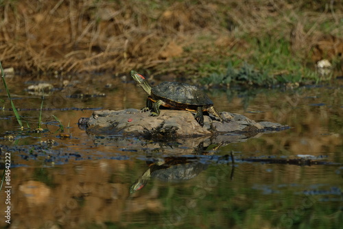 © Ahmetpekts, Fototapeta premium Water turtle sunbathing on the lake. Istanbul Türkiye