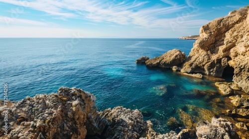 © Andrii, Fototapeta premium Waterbody Adjacent to Rocky Cliff