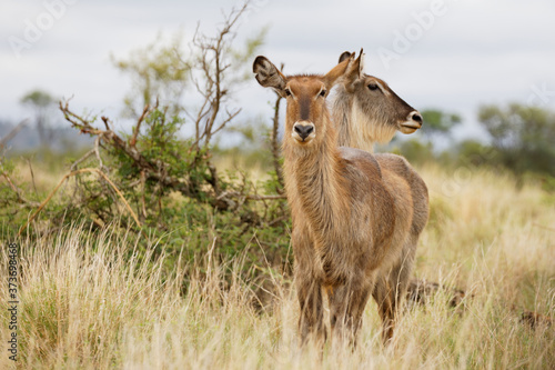© Beate, Naklejka premium Waterbuck posing in tall grass, one body two heads