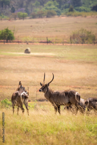 Naklejka premium Waterbucks standing in Savannah of Mlilwane Wildlife Sanctuary, Swaziland, Africa