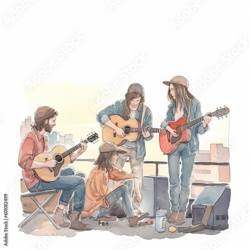© dhony, Fototapeta premium watercolor a band playing on a rooftop