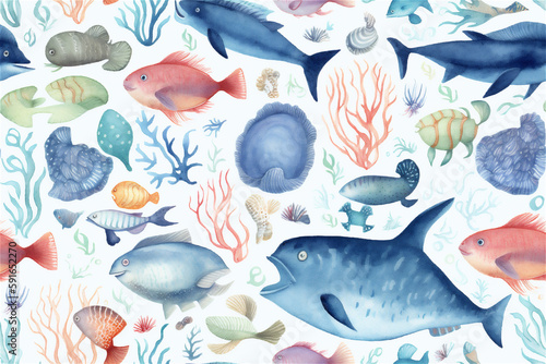 © Torvim, Naklejka premium Watercolor Abstract Ai Generative Illustration Inspired by Sea Life, Fishes, and Flora Elements