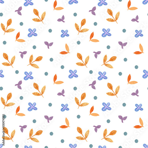 © Yevheniia Poli, Fototapeta premium Watercolor abstract ethnic seamless pattern. Floral simple dynamic pattern of colorful plants for textile, wrapping, background, scrapbooking, postcards