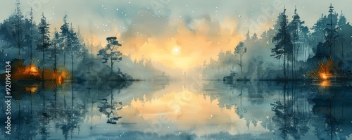 © King558, Naklejka premium Watercolor abstract evening reflections in forest with stars on white.