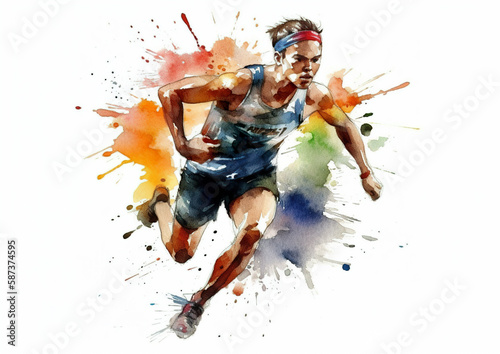 © Czintos Ödön, Fototapeta premium Watercolor abstract illustration of track and field.Sports abstract.Running with great momentum for a healthy life.Colorful paint splash during hurdle jump, isolated on white background.AI generated