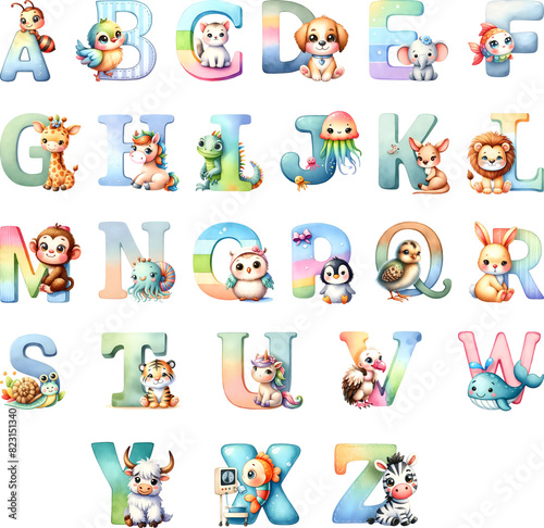 Obraz premium Watercolor animal english alphabet set from A to Z