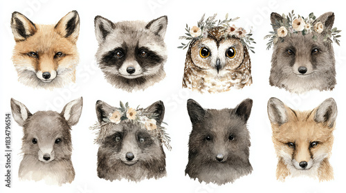 Fototapeta premium Watercolor animal portraits with floral crowns, including fox, raccoon, owl, and deer, charming and detailed wildlife art
