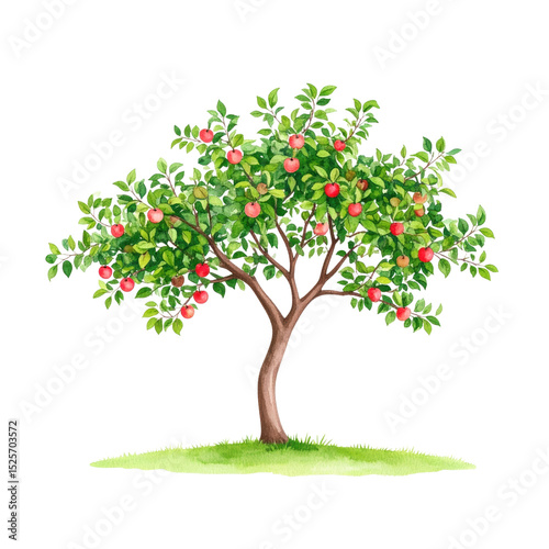 © Suryani, Fototapeta premium Watercolor apple tree with red fruits, green leaves, and grass isolated on transparent background. Concept of orchard, harvest, nature.