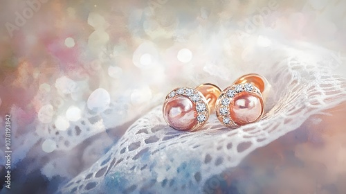 © Mingpon, Naklejka premium Watercolor Artistic using soft, brushy watercolor strokes, Single object picture - a pair of glittering earrings resting on a lace cloth, symbolizing elegance